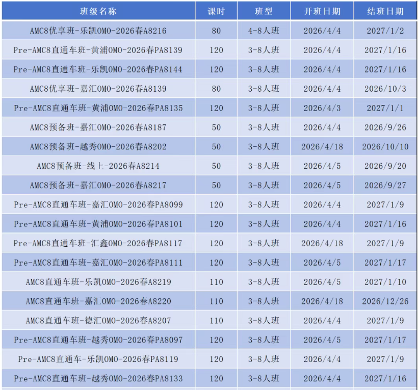 犀牛针对AMC8竞赛开设了AMC8预备班、Pre-AMC8直通车,AMC8直通车,AMC8基础班,AMC8强化班,AMC8冲刺班等班型,先测试后入班,根据测试结果匹配合适班型,线上线下可以同步授课,可以中英双语授课学习。
