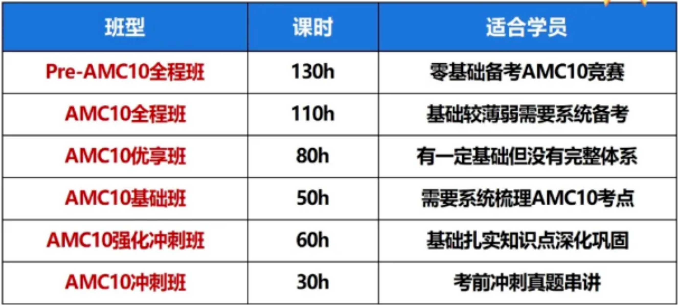 ▶AMC10课程:适合9-10年级,有一定初高中数学基础,需要系统备考AMC10竞赛。包含基础-强化-冲刺三大阶段课程。