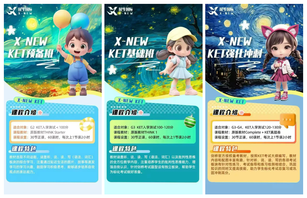 犀牛针对想要备考KET学生们,特设KET培训课程。犀牛KET班课共分为3个班型:KET预备班、KET基础班、KET强化冲刺班。根据孩子的英语基础与学习进度不同,我们会为孩子量身定制合适的课程!