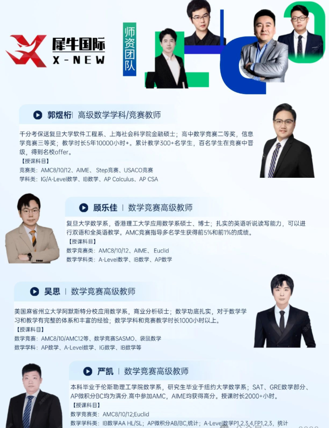 犀牛AMC竞赛师资团队都是由国内外顶尖名校毕业的教师组成,经过严格的选拔和培训,拥有丰富的数学教学经验和国际竞赛指导能力,熟知AMC竞赛的命题规律,同时各位老师均可纯英文或中英双语授课,能够为同学们提供针对性的指导,满足不同学生的学习需求,帮助各位同学实现快速提分。