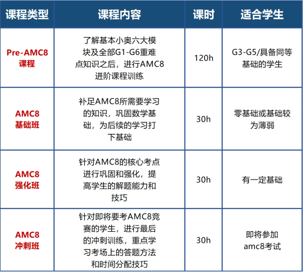学习内容:针对AMC8考试重难点题型和知识点强化提升,提高解题能力