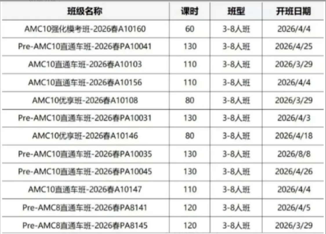 犀牛专为参加AMC10的同学开设了不同班型的课程,适合基础不同的学生。分为Pre AMC10全程班、AMC10全程班(基础+强化+冲刺),6-10年级学生均有合适的班型可以学习!