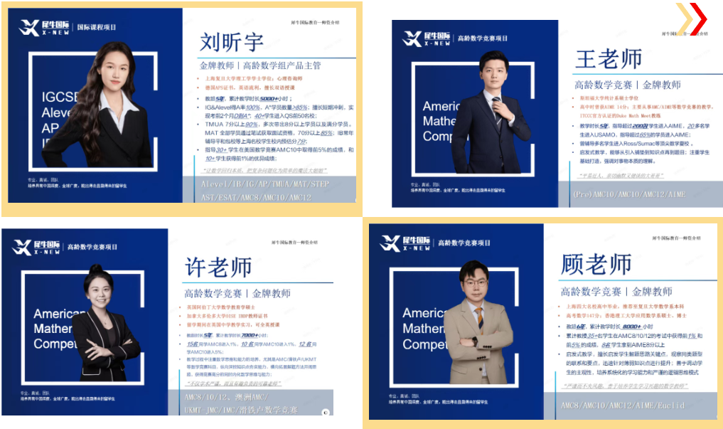 犀牛AMC10教研团队,均有多年国际竞赛教学经验、带出大量AIME晋级学员、熟悉 MAA 命题趋势的资深老师;老师均毕业于海内外顶尖名校(清北复交、海外 TOP30),双语教学流畅,既能讲透中文逻辑,又能适配竞赛答题思路;