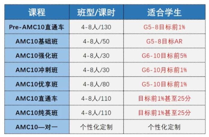 犀牛针对AMC10竞赛长线备考设有Pre-AMC10直通车、AMC10基础班、AMC10强化班、AMC10冲刺班以及AMC10全程班课程,适合不用基础的学生,先测试结果,根据情况匹配适合的课程。