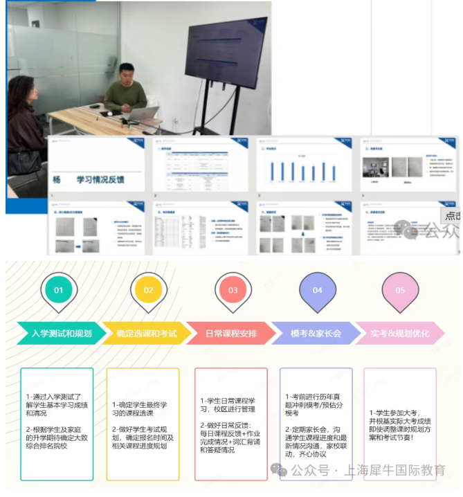 犀牛IGCSE课程完整服务流程:包含前测→选班→入班→建立班主任+老师+家长沟通群→进行课前提醒和课后反馈,以及课后作业答疑等环节,全方位保障学生的学习效果。