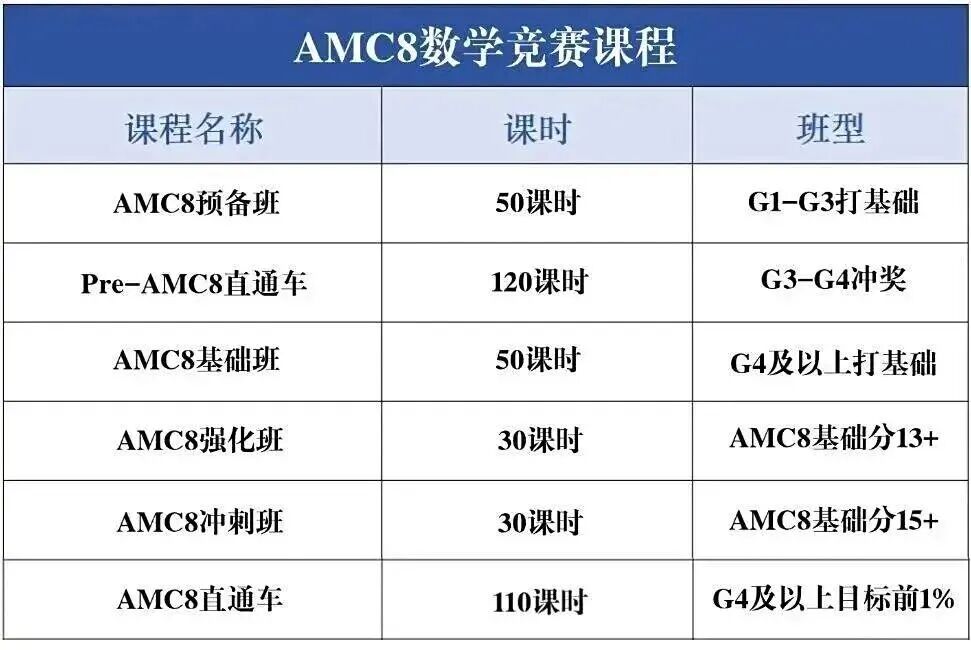 犀牛AMC8科学分层教学,针对不同年级、不同基础的学生,推出AMC8预备班、Pre AMC8直通车、AMC8直通车、AMC8基础班、AMC8强化班、AMC8冲刺班等班型,真正做到分层教学、因材施教,基础薄弱的同学们可选择AMC8直通车系统学习,长线备考!
