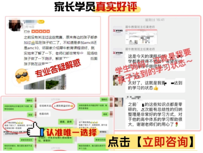 犀牛AMC10培训课程的优势不只在课前规划、课程体系完善和优秀的名校师资授课,还在课中和课后有专业的班主任老师和助教老师为同学们答疑解惑,向家长反馈学生学习进度,确保孩子能够正常吸收课堂内容!