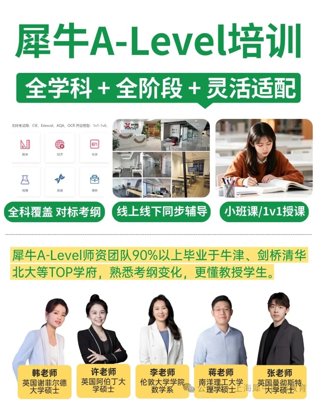 犀牛A-Level培训课程为学生提供全方位辅导,包括数学、英语、物理、化学、生物、商业、经济学、中文、计算机科学、地理和历史在内的多元化科目辅导。精准匹配CAIE、爱德思等主流考试局最新大纲。课程详情可咨询客服。