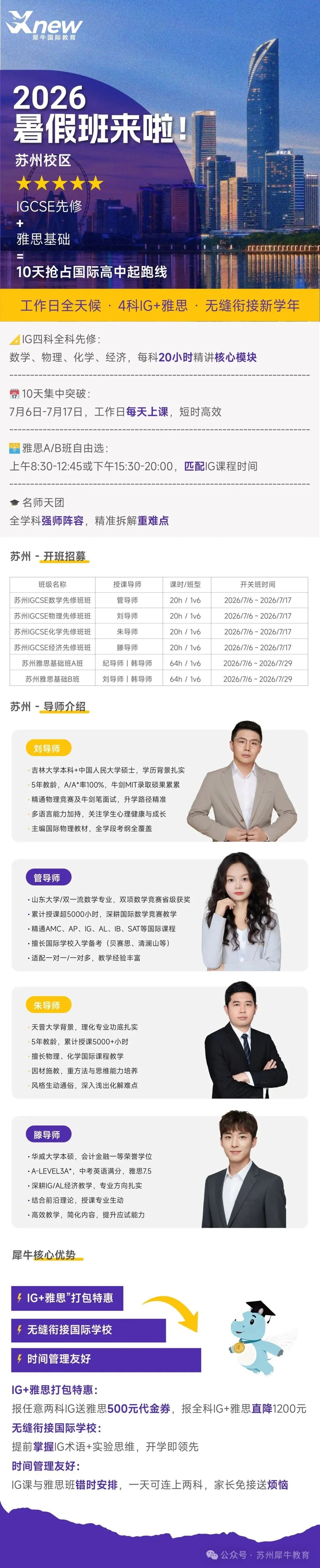 苏州犀牛的IG暑期班课表已出,开班时间段较多,想了解IGCSE暑假班课表,可以咨询客服获取最新课程安排~