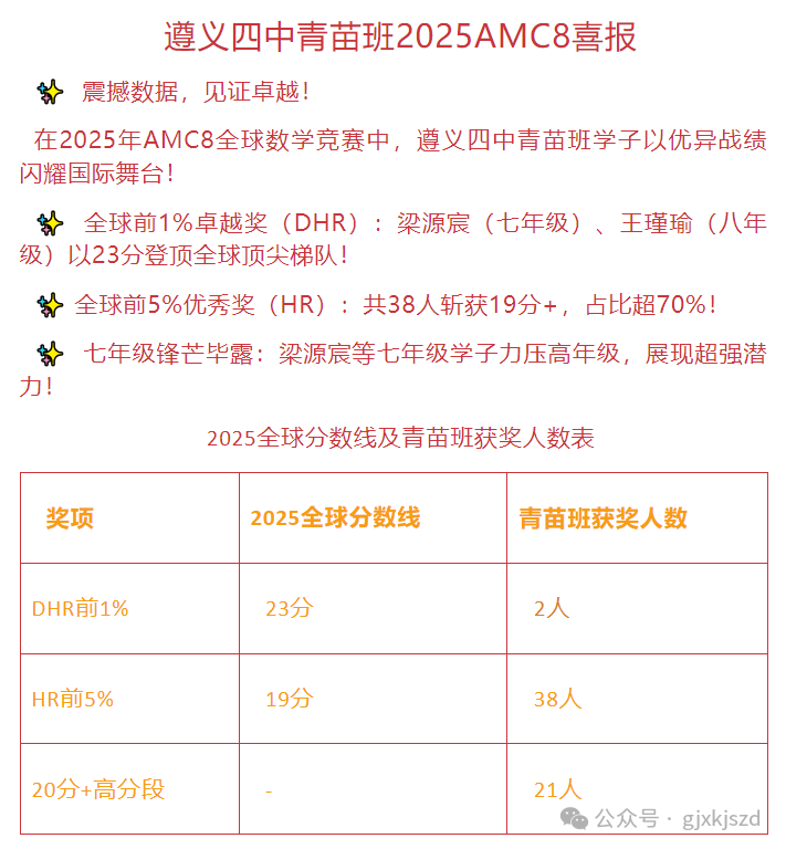 遵义四中青苗班也会组织学生参加AMC8数学竞赛,并取得优异成绩。