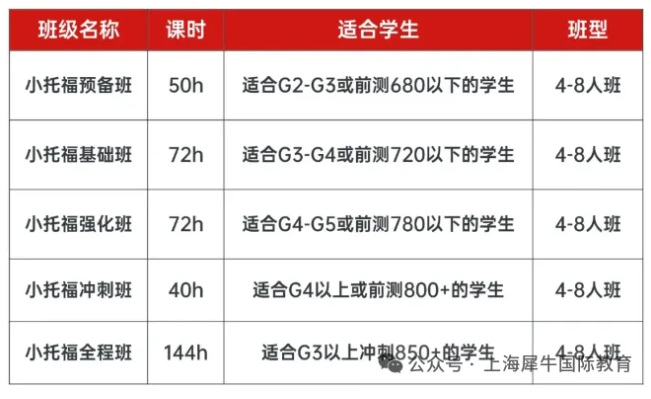 很多孩子因为选择的小托福课程不合适,导致基础薄弱的跟不上,基础较好的“吃不饱”。而犀牛上海小托福课程进行分层教学,无论孩子是初涉小托福,还是临近考试想冲刺高分,在这里都能找到适配的课程: