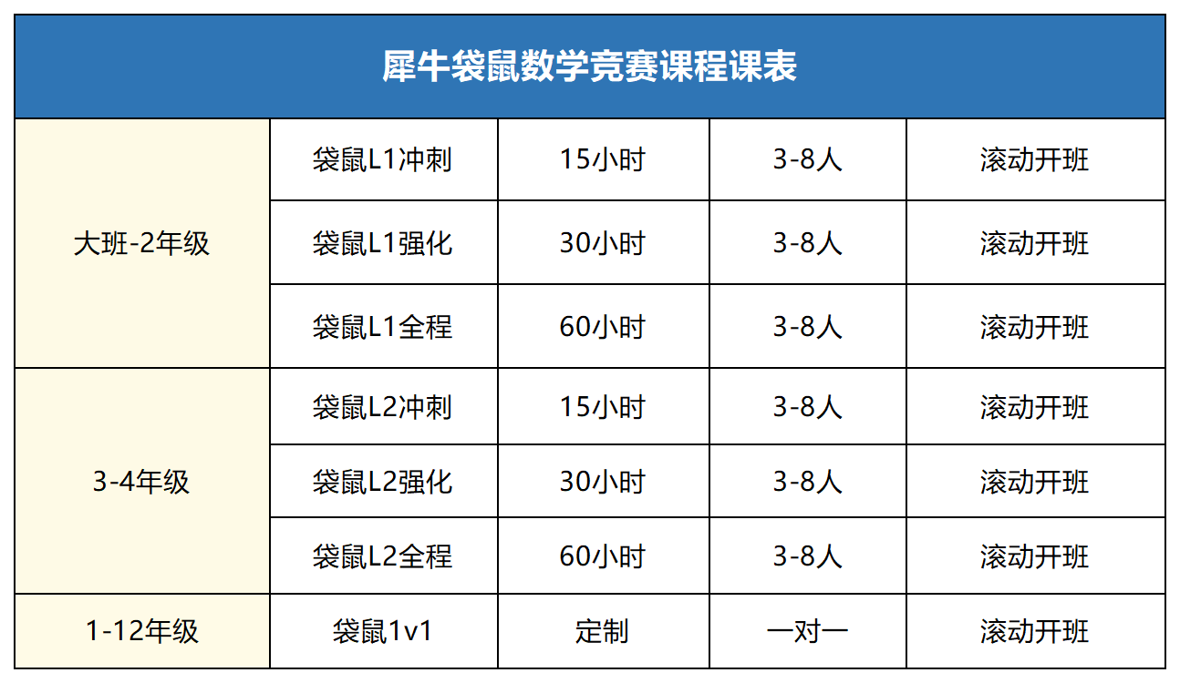 苏州小学段家长对理科尤其是数学格外重视,不少幼儿园大班以上的同学都在了解袋鼠数学竞赛,苏州袋鼠数学竞赛培训课程有哪些推荐?犀牛苏州校区袋鼠数学竞赛培训课程火热报名中,同时,咱们还帮在读学员提供代报名服务~