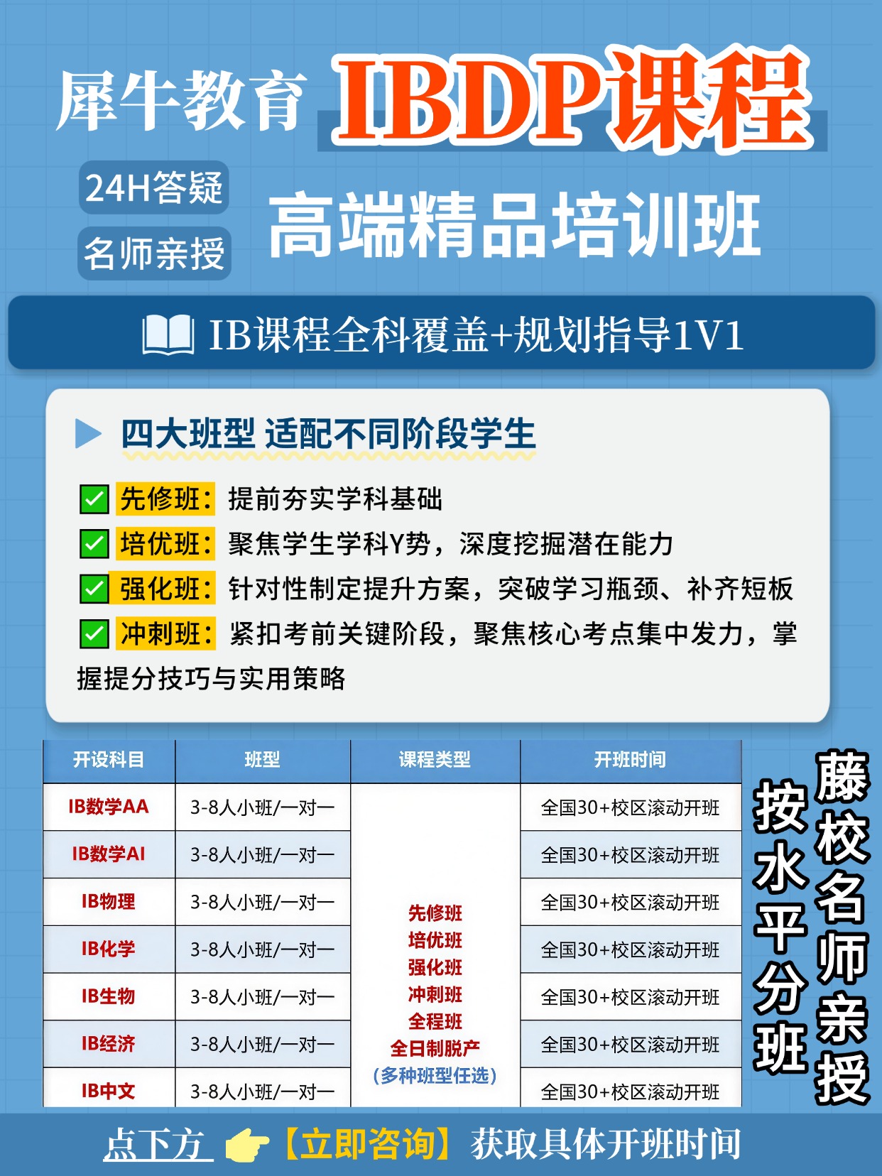 想要在IB考试中脱颖而出,进入心仪的世界名校,专业的辅导必不可少。犀牛教育IBDP高端精品培训班,就是你攻克IB难关的得力助手!