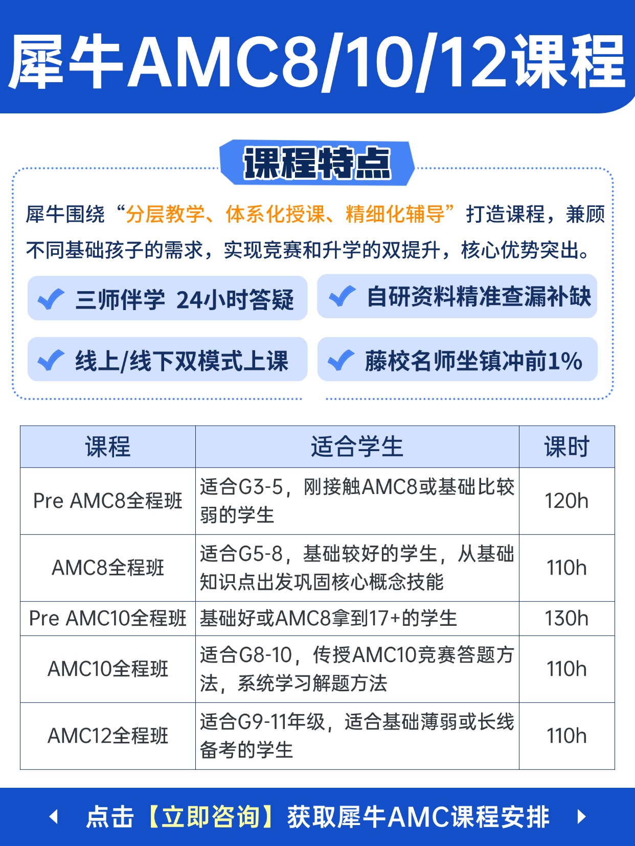 犀牛AMC8竞赛培训课程分阶段教学,拒绝 “一锅烩” 的大班教学,坚持先测评、后分班的精准教学模式。针对不同年级、不同基础的孩子,设置了完整的分层课程。