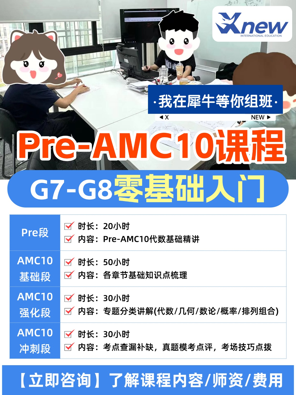 犀牛教育专为 7-8 年级学生打造 Pre-AMC10 衔接课程,目前全国火热组班中,上海、北京、深圳、苏州等多城同步开课,助力学生稳扎稳打备赛,高效冲击前 5%、前 1% 奖项!