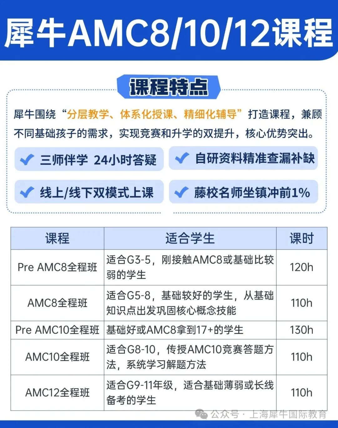 犀牛贴心人班服务,根据孩子入班前测成绩匹配Pre-AMC8直通车和AMC8直通车班课,量身打造属于自己的学习计划,杭州线上线下都可以上课,可根据自身情况选择。