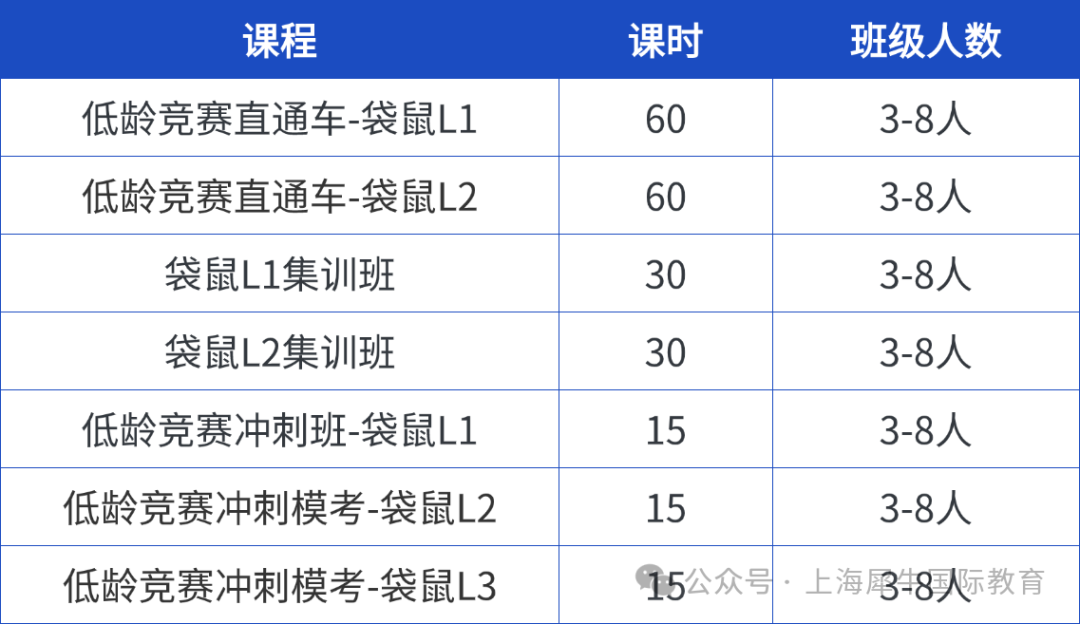 犀牛针对不同基础和年级的学生开设袋鼠竞赛全程班、冲刺班和寒暑假集训班多种班型,小班课3-8人授课,确保教学质量,每个班的开班时间段较多,具体时间可联系客服。