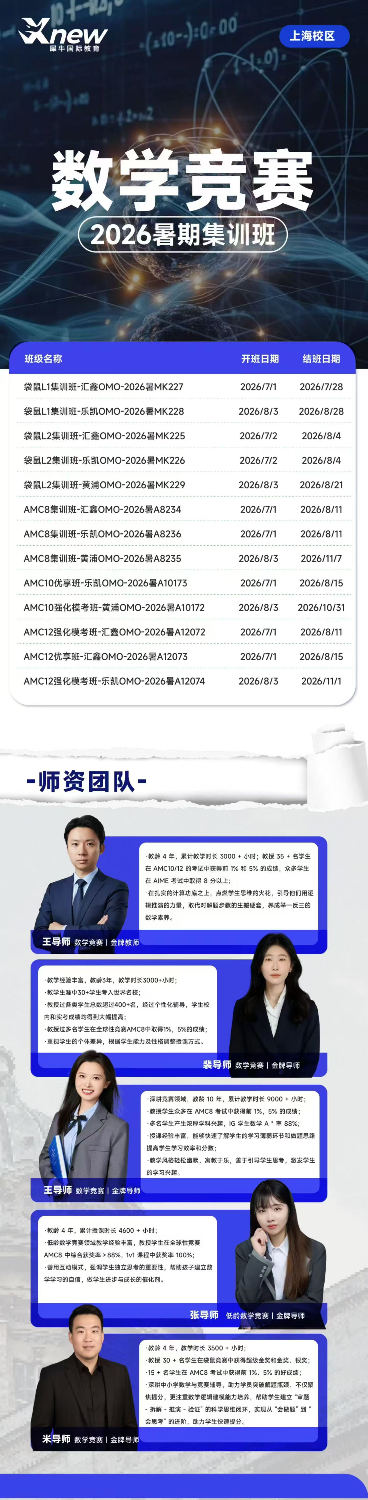 犀牛AMC8课程暑期班师资也是顶配,都是毕业于北大、清华、复旦以及海外名校的名师,从事AMC8辅导多年, 熟知AMC8竞赛命题规律,能够为学生提供高质量的课堂内容。